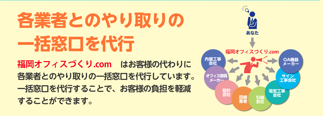 オフィスづくりに一括対応 - オフィス環境作りでは、オフィス内装工事会社やオフィスデザイン会社、引越会社、パーテーションメーカー、オフィス家具メーカーなど複数の業者との連絡や調整が発生します。そのため、オフィス環境作りの規模が大きくなるほど、各業者との連絡作業や調整作業が複雑になります。福岡オフィスづくり.comは福岡県福岡市周辺のオフィス環境作りに関わる業務に一括対応しています。