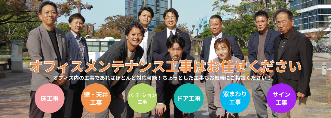 - 福岡オフィスづくり.comは、オフィス環境作りの大きさに関係なくオフィス環境作りのサポートを行っています。オフィス移転やオフィスリニューアルのような大規模工事だけではなく、数千円のようなちょっとした小規模工事にも喜んで対応いたします。どこに頼んだら良いのかわからないような補修箇所があれば、福岡オフィスづくり.comにご相談ください。私たちはオフィスのちょっとした工事にも丁寧に対応してきた実績があります。