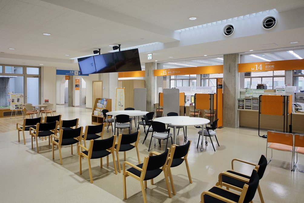 待合スペースでは、来庁された方が快適にお待ちいただける空間を目指しました。モニターを見やすいレイアウトで什器を配置することで、呼び出しに気づきやすくなり、運営の効率化に繋がっています。